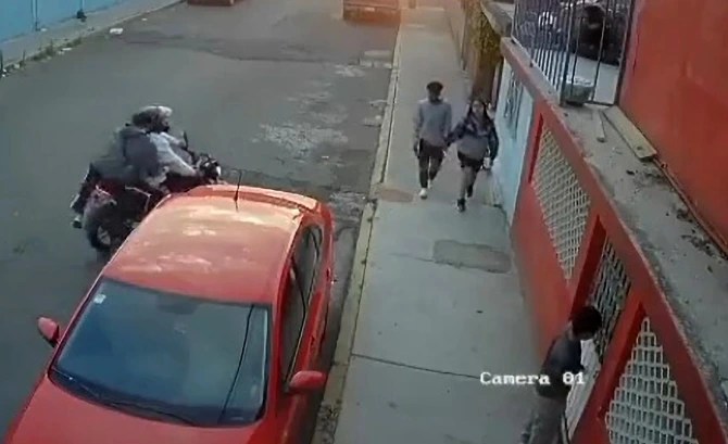 Las imágenes muestran a la pareja caminando por la calle tomados de la mano mientras dos hombres en una motocicleta se acercan a la pareja.