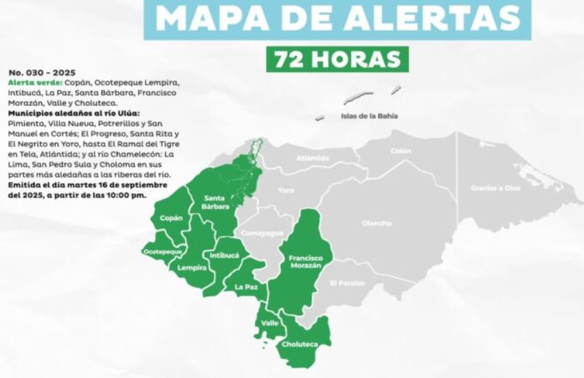 Tegucigalpa, 17 de septiembre de 2025 — La Comisión Permanente de Contingencias (Copeco) declaró Alerta Verde en nueve departamentos del país debido a las condiciones climáticas inestables provocadas por una vaguada en superficie. La medida estará vigente desde las 10:00 de la noche del martes hasta el viernes a la misma hora, abarcando un periodo de 72 horas.