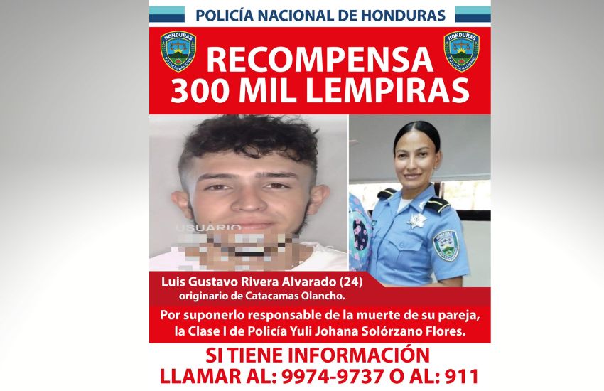 La Policía Nacional ha ofrecido este martes una recompensa de 300 mil lempiras por información sobre el paradero del ciudadano Luis Gustavo Rivera Alvarado de 24 años, quien se se supone sería el presunto responsable de la muerte de la agente de policía, Yuli Johana Solórzano Flores, asesinada este lunes en la capital.